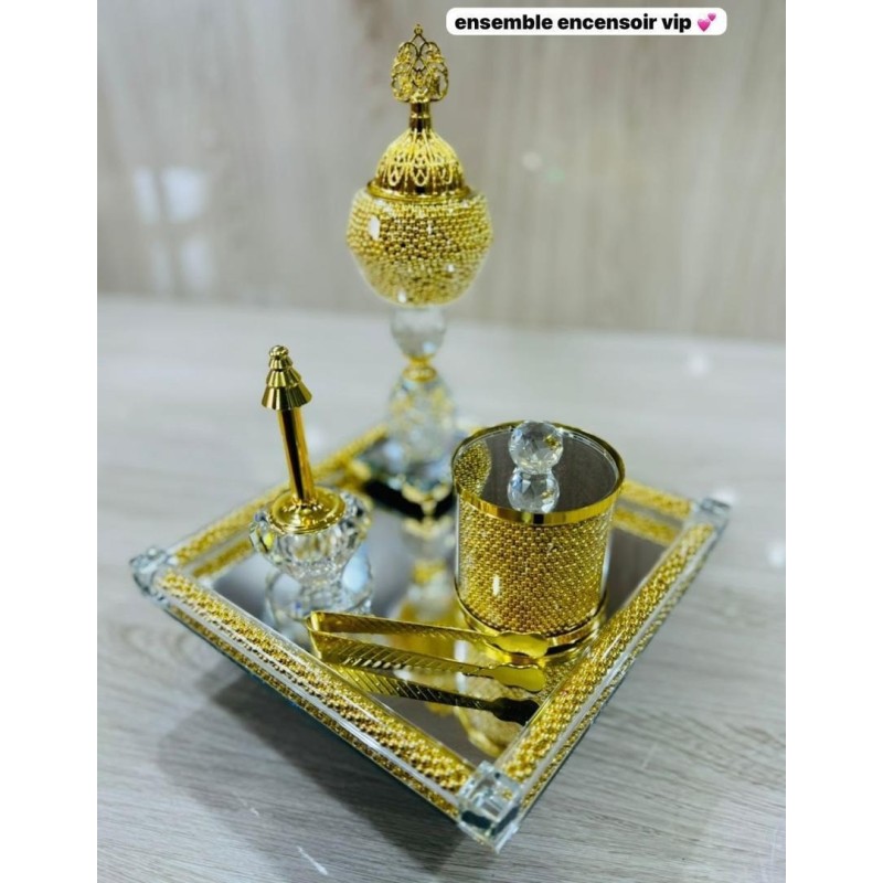 Cet ensemble d'encensoirs sur un plateau tournant allie l'élégance et la fonctionnalité pour offrir une expérience apaisante. Le brûleur à encens, en cristal transparent, est doté d'un couvercle doré finement orné, ajoutant une touche de sophistication. À côté de celui-ci, un petit pot doré permet de stocker l'encens, tandis que le porte-encens en cristal assure la stabilité et la sécurité de vos bâtons d'encens. Une petite cuillère dorée vient compléter l'ensemble, parfaite pour manipuler l'encens avec délicatesse. Le plateau tournant, rond et magnifiquement décoré, repose sur un bord orné de petits cristaux scintillants, apportant une touche de brillance à votre espace. Ce produit est idéal pour ceux qui recherchent à la fois un objet fonctionnel et décoratif pour leur ambiance zen.
