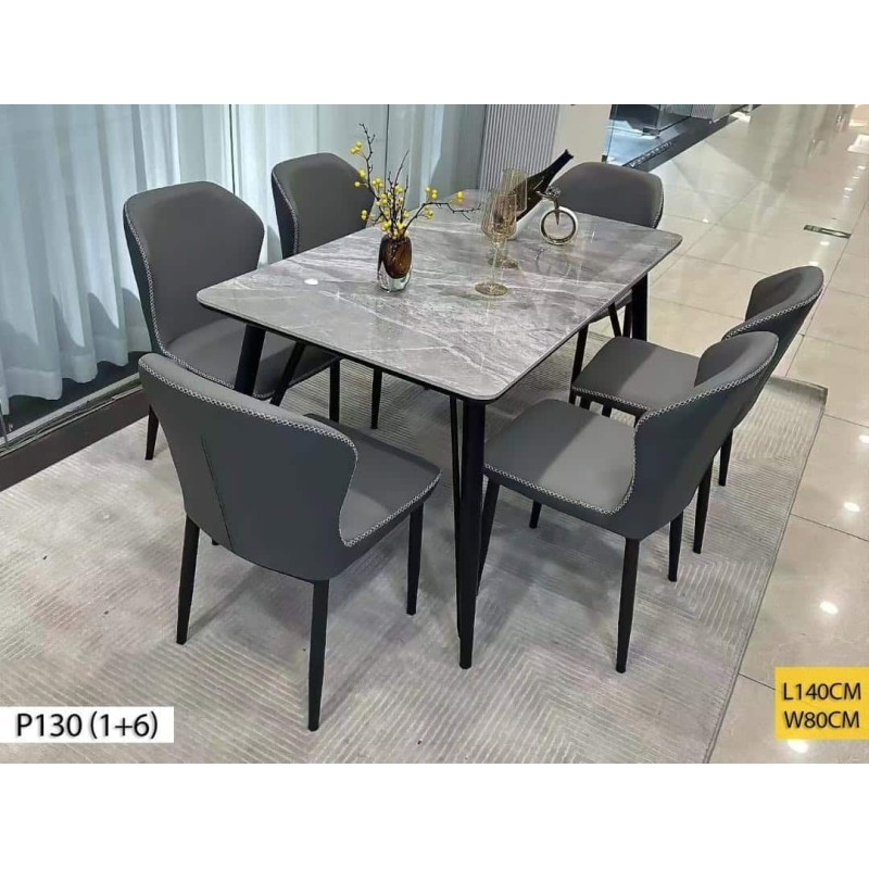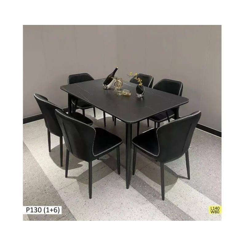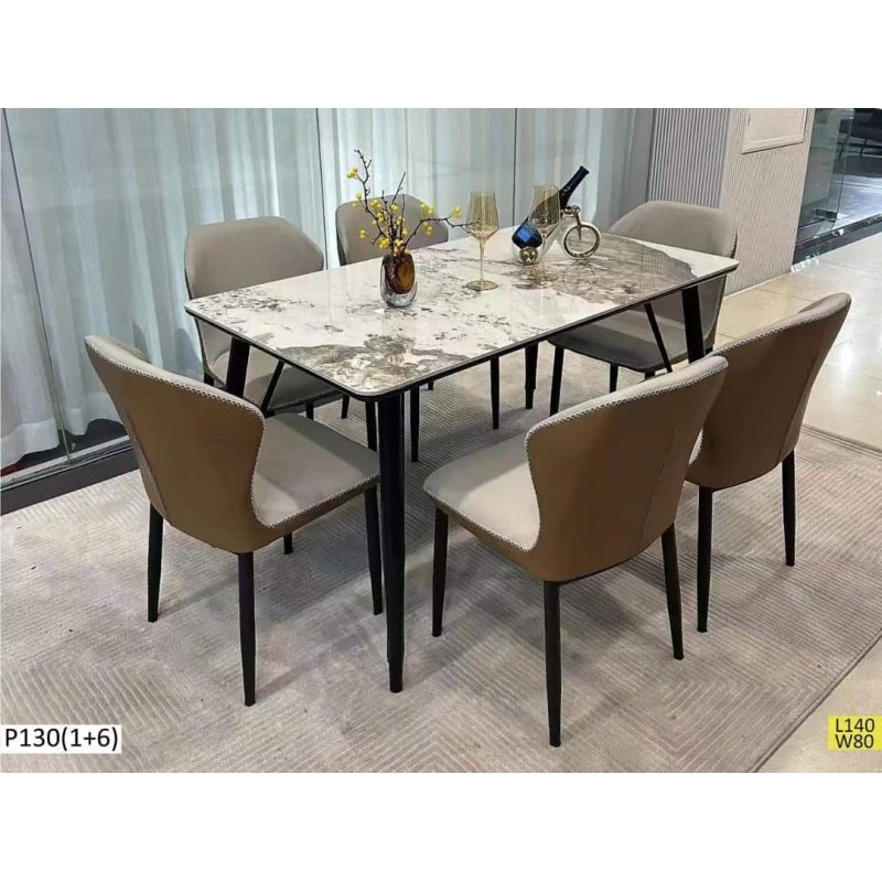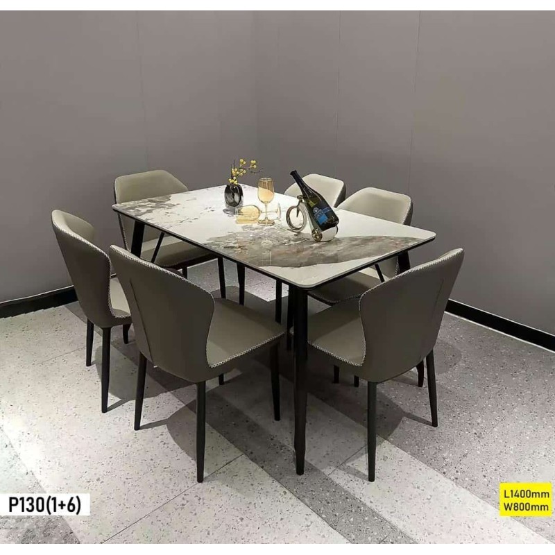 Élégant et moderne, l’ensemble de salle à manger P130 (1+6) comprend une table imitation marbre et six chaises assorties. Idéal pour accueillir jusqu’à six convives, il allie design raffiné, matériaux de qualité et confort durable.