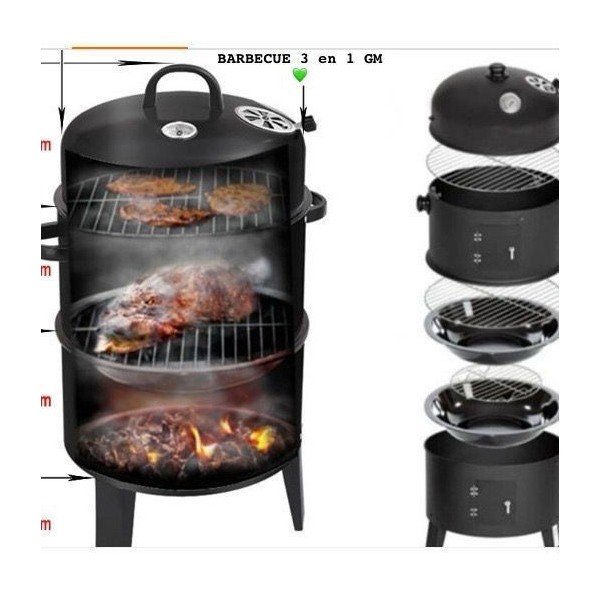 Ce barbecue offre une multitude de possibilités en terme de cuissons et de plats. Il s'utilise en tant que barbecue traditionnel ou fumoir, c'est à vous de voir. Il est composé d'un capot, d'un compartiment de fumage avec porte et d'une cuve à charbon également avec portes. Ces deux portes permettent de rajouter du liquide de fumage et du copeau de bois. Ces deux éléments sont primordiaux car ce sont eux qui apporteront le goût de fumage à votre viande ou poisson.