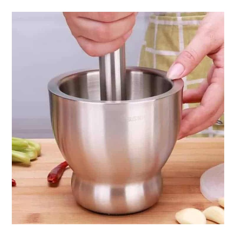 Broyez vos épices et herbes avec efficacité et propreté grâce à ce mortier et pilon en acier inoxydable 18/8 de qualité alimentaire, conçu pour allier durabilité, hygiène et praticité. Sa structure en acier inox 304 le rend résistant à la rouille, sans arrière-goût ni absorption des odeurs. Le pilon lesté assure un broyage rapide et uniforme, tandis que la paroi intérieure lisse permet une mouture fine sans effort.