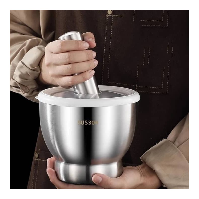 Mortier et pilon en acier inoxydable 18/8 avec couvercle – broyeur manuel idéal pour les épices, herbes et graines. Solide, antirouille, sans arrière-goût. Facile à nettoyer, compact et durable.