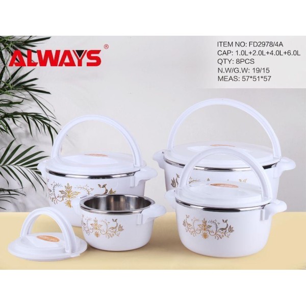 Un ensemble de 4 grands bols avec couvercle pour servir Très bonne qualité en plus de son joli design ,neuf et pratique.