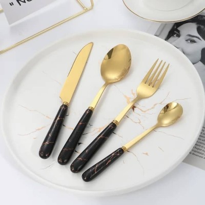 Ensemble de couverts élégants avec têtes dorées et manches effet marbre aux veines dorées, parfait pour une table chic et moderne.
